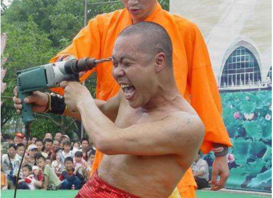 Màn trình diễn ấn tượng nhất mà nhà sư Thiếu Lâm thường thể hiện dĩ nhiên là khoan vào thái dương. Nhiều tiết mục của Hồ Quỳnh được khuyến cáo không nên bắt chước vì quá nguy hiểm.