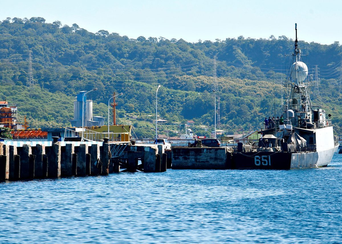 Một tàu Hải quân Indonesia tại cảng, khi quá trình tìm kiếm tàu ngầm KRI Nanggala-402 mất tích đang diễn ra, ở Banyuwangi, tỉnh Đông Java Indonesia, ngày 23/4. (Ảnh: Reuters)
