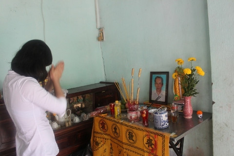 Đứng trước bàn vong cha, chị Nguyễn Đỗ Ngọc Châu (23 tuổi, con ruột nạn nhân) vừa thắp nhang vừa chực rơi nước mắt.