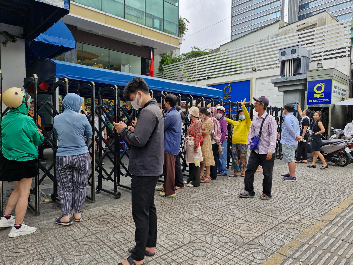 Sau 9h sáng 10/6, trụ sở trung tâm SJC trên đường Nguyễn Thị Minh Khai, Quận 3 đã đóng cửa, những người đến sau kiên nhẫn đứng chờ. (Ảnh: Hà Linh)