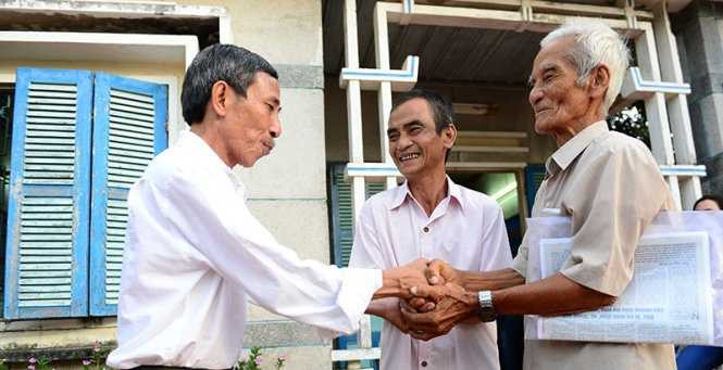 | Cha con ông Huỳnh Văn Truyện và Huỳnh Văn Nén bắt tay ân nhân của mình là thầy giáo Nguyễn Thận (bìa trái) - Ảnh: Quang Định |