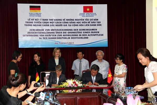 Hôm nay, Đại sứ Đức tại Việt Nam, bà Jutta Frasch cùng ông Nguyễn Thanh Hòa, Thứ trưởng Bộ Lao động, Thương binh và Xã hội (MOLISA) đã cùng nhau kí kết Ý định thư chung về những nguyên tắc cơ bản trong tuyển chọn học viên một cách công bằng để đào tạo trong ngành chăm ngành chăm sóc người già tại CHLB Đức.