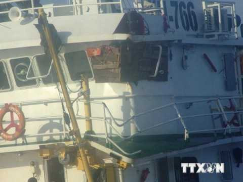 | Tàu Kiểm ngư Việt Nam bị hỏng nặng do tàu Trung Quốc đâm va. Ảnh Văn Sơn-TTXVN |