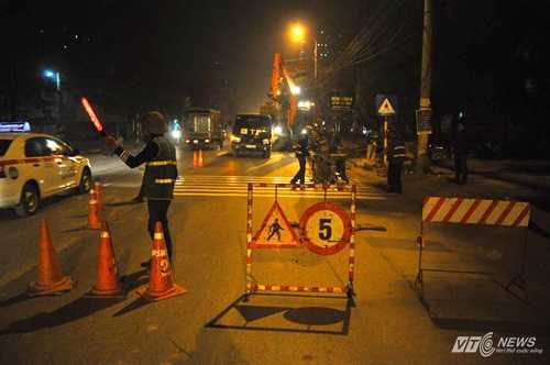 | Các công nhân làm việc xuyên đêm để gấp rút hoàn thiện các biện pháp trước mắt để đảm bảo an toàn cho người dân khi qua đường - Ảnh Minh Chiến |