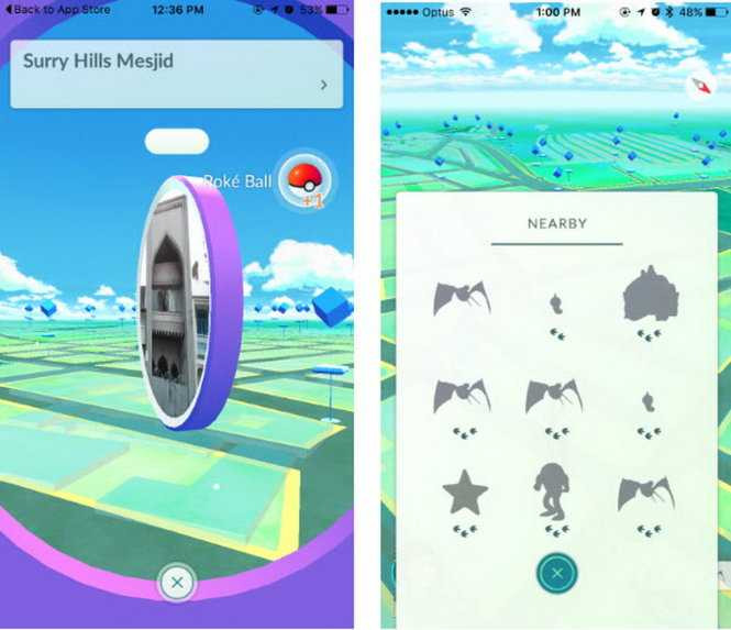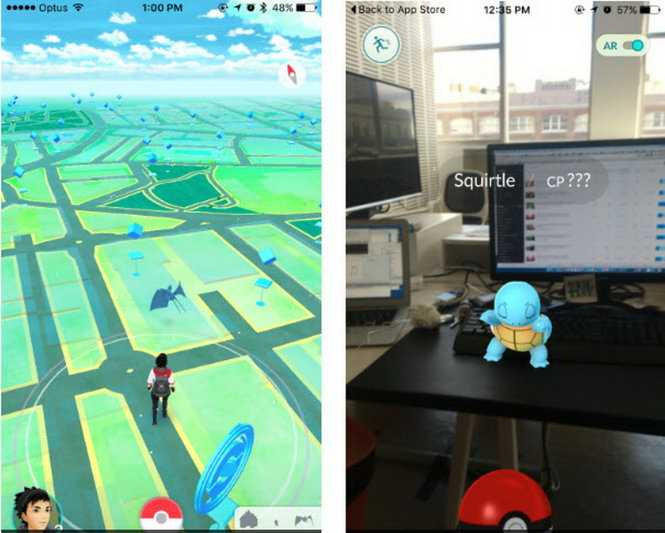| Đi tìm trên bản đồ số dựa theo vị trí địa lý định vị bằng GPS trên thiết bị (ảnh bên trái) và một loại quái thú xuất hiện trên bàn làm việc qua công nghệ AR (phải) - Ảnh: Mashable |