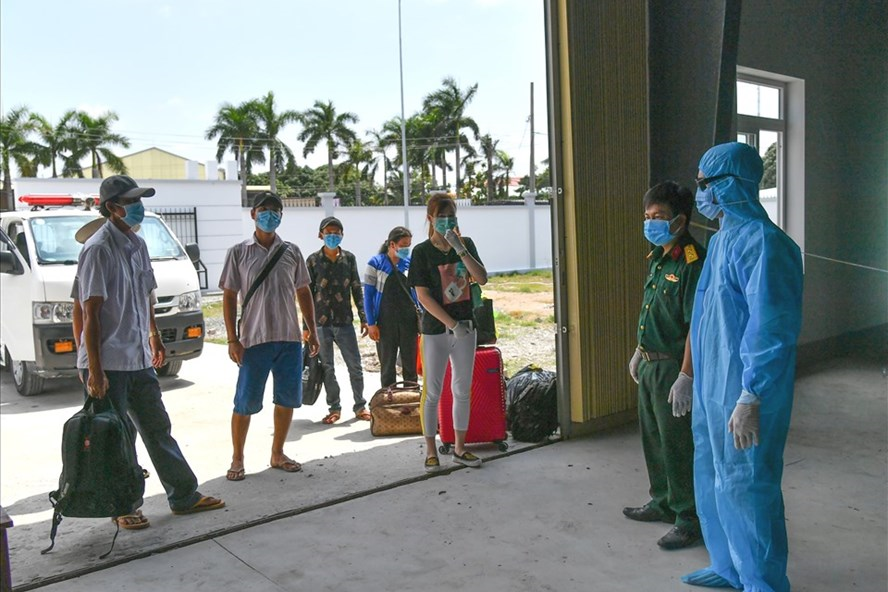 Lực lượng chức năng tiếp nhận và cách ly người dân nhập cảnh về nước. (Ảnh: Phương Vũ)