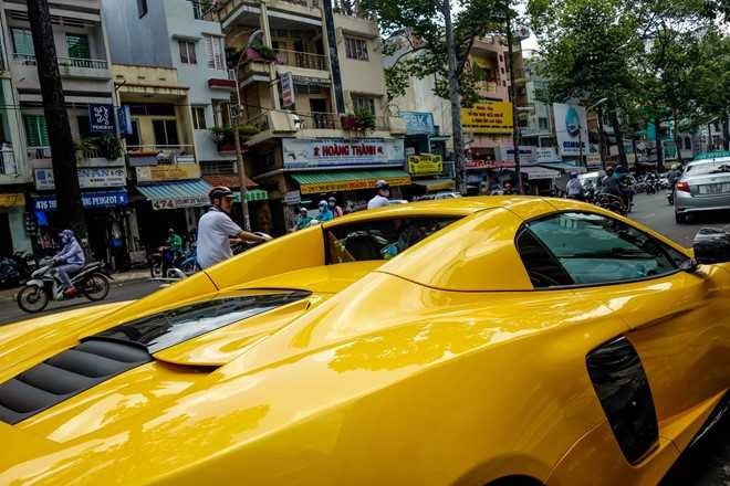 Chiều 11/6, siêu xe McLaren 650S Spider màu vàng duy nhất Việt Nam xuất hiện trên đường phố Sài Gòn. Chủ nhân của siêu xe này là thiếu gia Phan Thành, người nổi tiếng bởi bộ sưu tập xe trị giá hàng triệu USD.