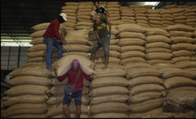 Công nhân chất gạo tại một nhà kho ở Bangkok - Thái Lan. (Ảnh: BANGKOK POST)