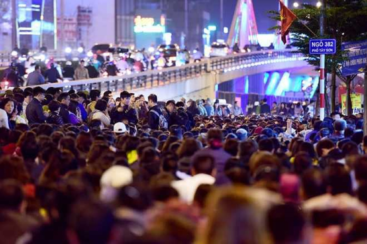 Cảnh biển người chen lấn trên đường dự lễ cúng sao giải hạn chùa Phúc Khánh, Hà Nội.