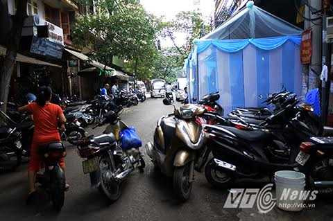 | Rạp cưới, xe máy của khách chiếm trọn lòng đường |
