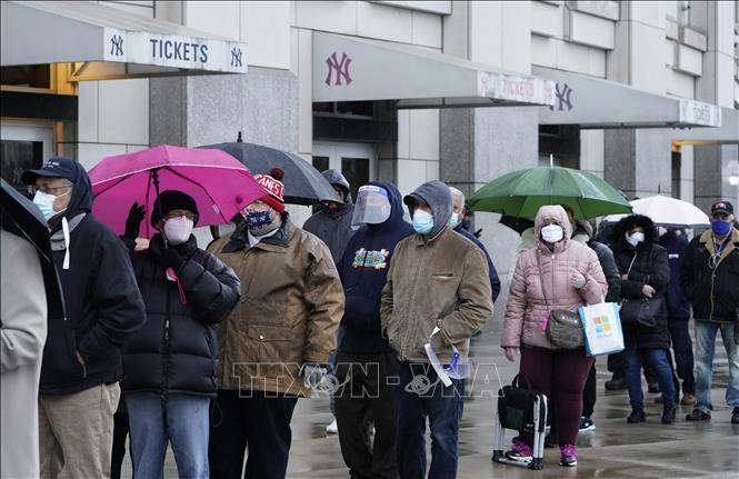 Người dân đeo khẩu trang phòng lây nhiễm COVID-19 tại một điểm tiêm chủng ở New York, Mỹ. (Ảnh: AFP/TTXVN)