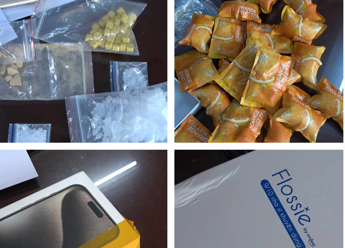 Tang vật thu giữ là 67 viên nén có tổng khối lượng hơn 45g, 06 gói ni - lông bên trong chứa tinh thể rắn màu trắng có khối lượng hơn 32g và 23 gói “Orange fruit tea”. Số tang vật này được đóng gói cẩn thận trong hộp điện thoại iPhone, hộp ghi các dòng chữ máy tăm nước nhằm ngụy trang.