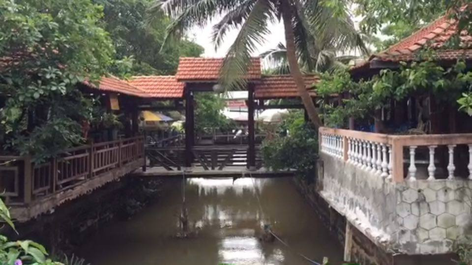 Hệ thống mái chòi, cột gỗ tại quán cà phê của ông Thi được dựng qua kênh trái phép. (Ảnh: QT)