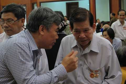 | Nguyên Chủ tịch nước Nguyễn Minh Triết (phải) trò chuyện với đại biểu tại lễ kỷ niệm - Ảnh: Trung Hiếu |