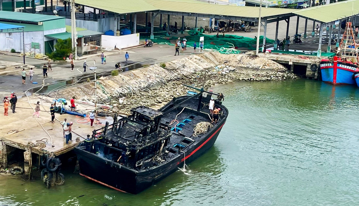 Hiện trường tàu cá cháy tại cảng Ninh Chữ ngày 30/7.
