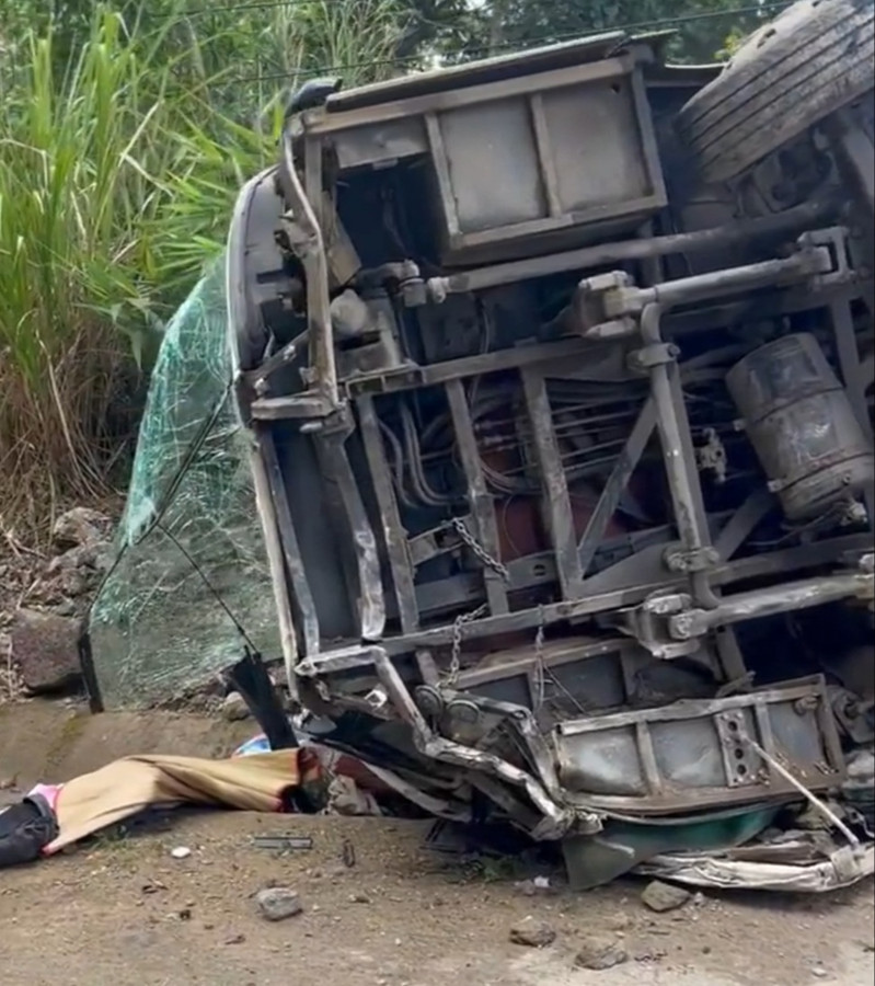 Tài xế khai nhận khi đang đổ dốc đèo Khánh Lê (Khánh Hòa) thì bất ngờ xe mất thắng nên lật nhào.