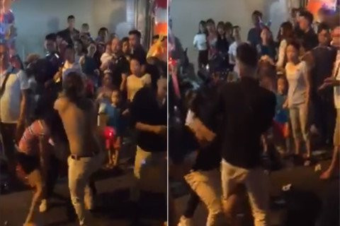 Trong lúc hai bên đang giằng co giữa đường thì cô gái đi cùng nam thanh niên bị giật tung áo trước đám đông. Dù không mặc áo, cô gái vẫn hùng hổ tiếp tục lao vào giằng co, đánh nhau với hai người phụ nữ. Nam thanh niên sau khi can ngăn không được cũng xông vào đánh 2 phụ nữ kia.