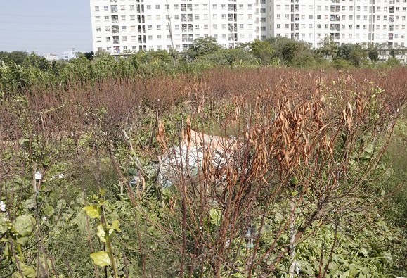 Hàng nghìn gốc đào chuẩn bị bán Tết Nguyên đán 2020 của người dân Tổ dân phố Nhật Tảo, phường Đông Ngạc (Bắc Từ Liêm, Hà Nội) bị chết vàng, khô quắt.