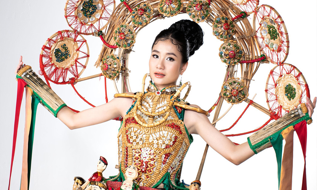 12 con rối trên bộ trang phục được thực hiện hoàn toàn bằng vật liệu tái chế, thân thiện với môi trường như cói, lát, mây, tre, lục bình theo đúng tiêu chí của ban tổ chức.