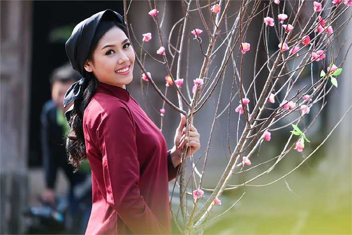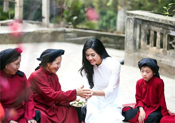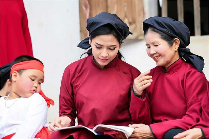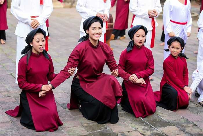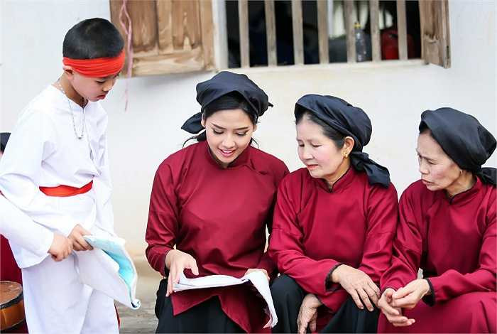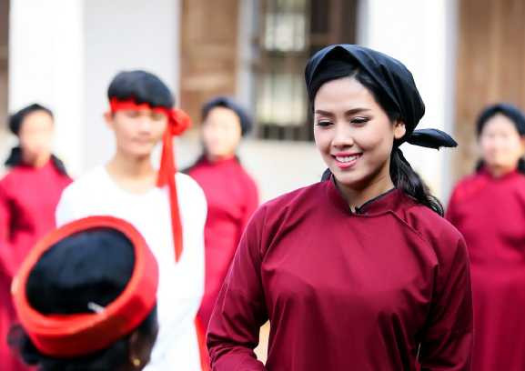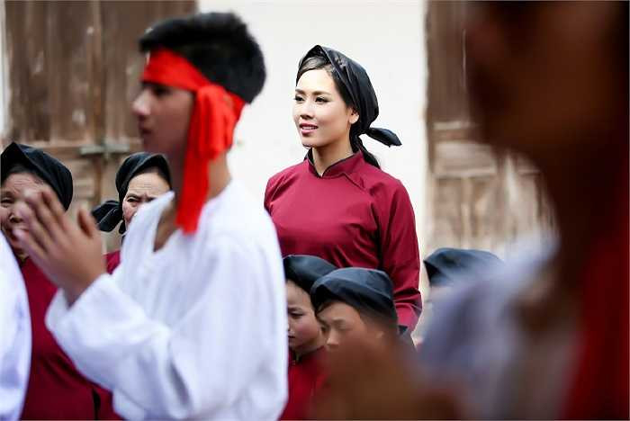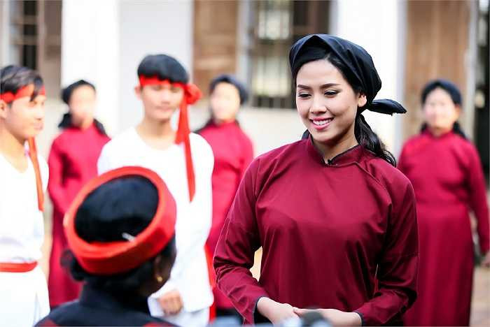 khăn vuông mỏ quạ, Nguyễn Thị Loan rạng rỡ hóa cô đào và hòa mình vào điệu hát Xoan phường An Thái. Top 25 người đẹp nhất thế giới- Miss World 2014 tỏ ra vô cùng hào hứng khi lần đầu được tham gia học hát Xoan- loại hình nghệ thuật dân gian độc đáo của người dân miền trung du.