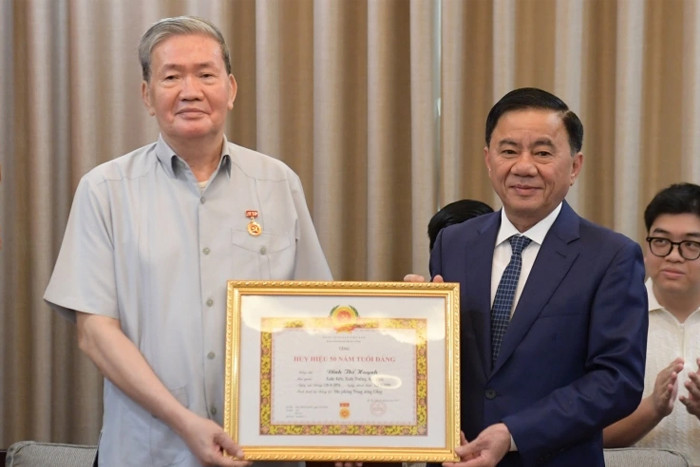 Thường trực Ban Bí thư, Chủ nhiệm Ban kiểm tra Trung ương Trần Cẩm Tú trao Huy hiệu 50 năm tuổi Đảng cho nguyên Thường trực Ban Bí thư Đinh Thế Huynh.