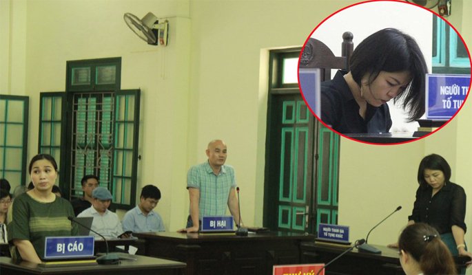 Bị cáo Nguyễn Thị Vân, bị hại Nguyễn Văn Thiện và nữ thượng úy công an Nguyễn Thị Vững tại phiên tòa ngày 10/4.
