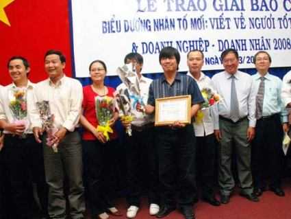 Nhà báo Hoàng Hùng (giữa) cùng các đồng nghiệp trong một lần nhận giải báo chí tại Hội Nhà báo TPHCM