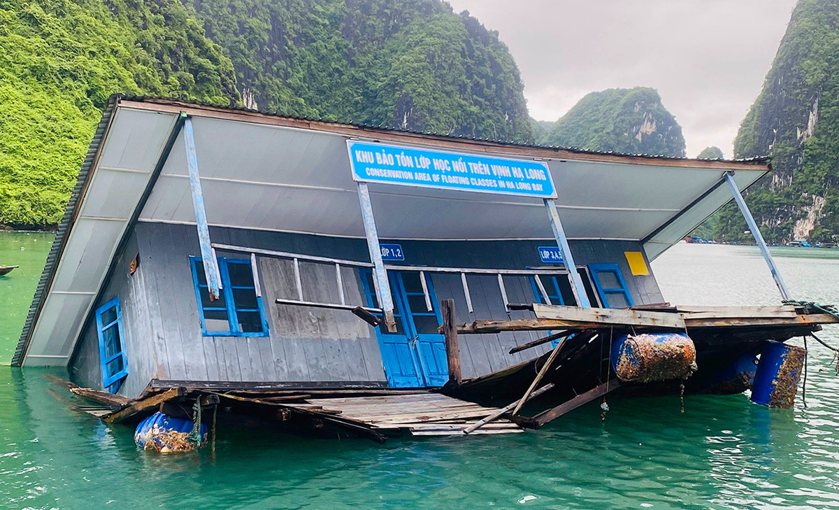 Hôm nay (27/9), ông Nguyễn Trung Hậu, Phó Trưởng Ban quản lý vịnh Hạ Long cho biết, những ngày qua có mưa kèm gió lớn khiến một ngôi nhà gỗ tại khu nhà bảo tồn lớp học nổi ở làng chài Cửa Vạn bị nghiêng và sắp chìm xuống biển.