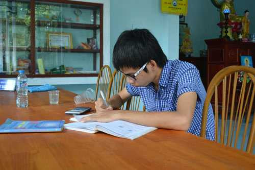 | Em Trần Duy Sang (Bình Định), một trong những sĩ tử có mặt ở chùa Quang Minh từ ngày hôm qua, đang ngồi ôn bài. |