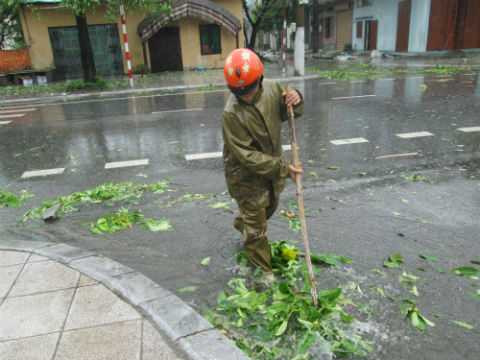 | Công nhân môi trường làm công tác vệ sinh, thoát nước trên phố sau bão. |