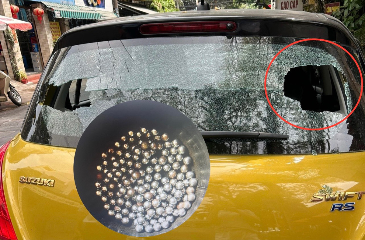 Ô tô bị vỡ kính do bị bi sắt văng trúng.