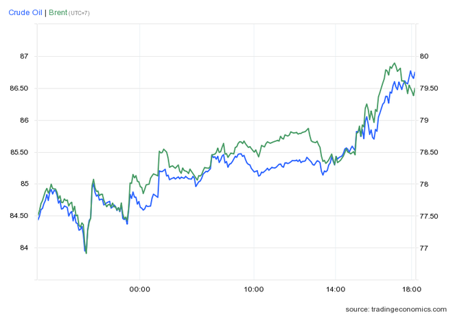 Trong vòng 24 giờ qua, mỗi thùng dầu Brent đã tăng 1,17 USD lên 86,51 USD/thùng, thu hẹp mức giảm so với một tháng trước đó xuống 7,78%. Hôm 22/11, giá dầu Brent đã rơi xuống dưới ngưỡng 84 USD/thùng, thấp nhất trong gần 2 tháng.