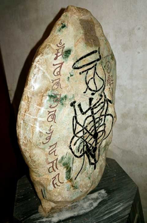 Hòn đá có cao khoảng 50cm, bề rộng nhất khoảng 35cm, hình cánh buồm, được đặt trên bệ hình bát quái. Mặt trước và sau của hòn đá có nhiều ký tự cổ, dấu ấn vuông, họa tiết phức tạp, khó hiểu, trông như một lá bùa có 2 mặt.