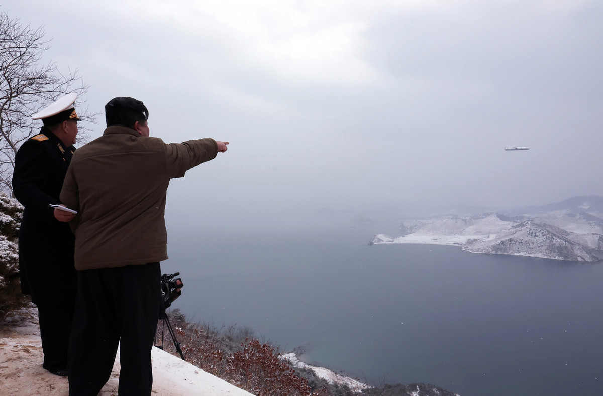 Nhà lãnh đạo Kim Jong-un (phải) ngày 28/1/2024 đã thị sát vụ phóng thử tên lửa hành trình chiến lược “Pulhwasal-3-31” từ tàu ngầm và dự án chế tạo tàu ngầm hạt nhân của Bình Nhưỡng. (Ảnh: Yonhap/TTXVN)
