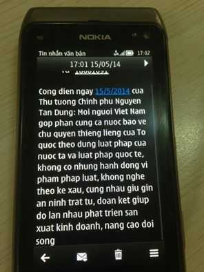 SMS2: “Cong dien ngay 15/5/2014 cua Thu tuong Chinh phu Nguyen Tan Dung: Moi nguoi Viet Nam gop phan cung ca nuoc bao ve chu quyen thieng lieng cua To quoc theo dung luat luat phap cua nuoc ta va luat phap quoc te, khong co nhung hanh dong vi pham phap luat, khong nghe theo ke xau, cung nhau gin giu an ninh trat tu, doan ket giup do lan nhau phát trien san xuat kinh doanh, nang cao doi song”.