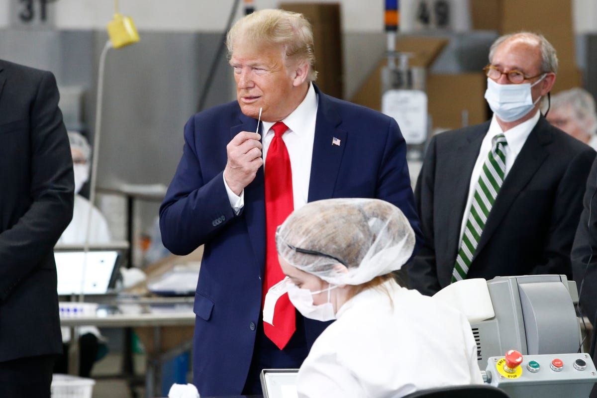 Trong khi các công nhân trong nhà máy mặc áo khoác phòng thí nghiệm và mang trang bị bảo hộ cá nhân, ông Trump không đeo khẩu trang trong khi tham quan cơ sở và nhân viên.