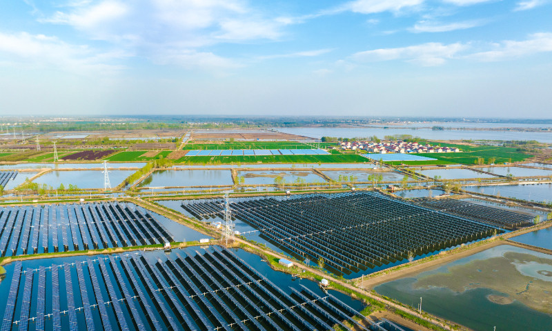 Các tấm pin mặt trời được lắp đặt trên một khu công nghiệp thủy sản hiện đại ở tỉnh Giang Tô (Trung Quốc), tận dụng triệt để đất hoang, bờ sông, hồ và mái nhà để xây dựng các dự án phát điện quang điện. (Ảnh: Global Times)