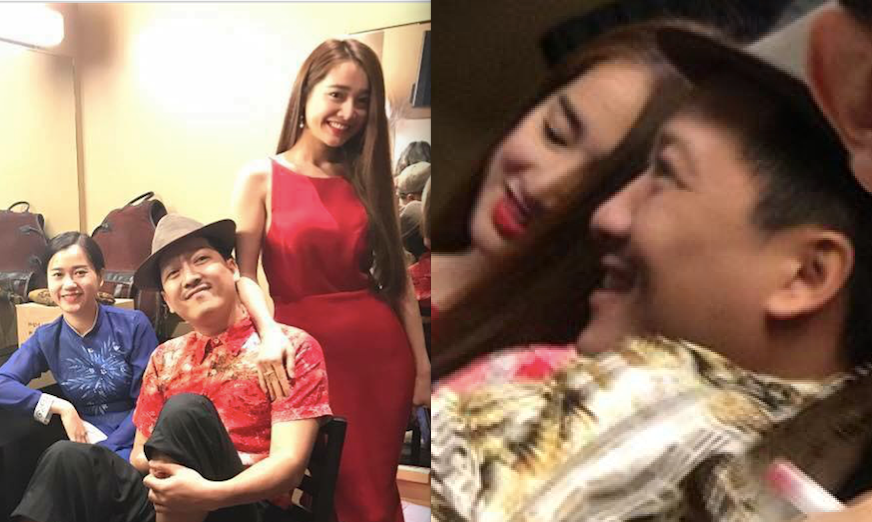 Chí Tài và người quản lý nhí nhảnh tạo dáng. Nhã Phương và Trường Giang ở phía sau cũng rất thân mật.