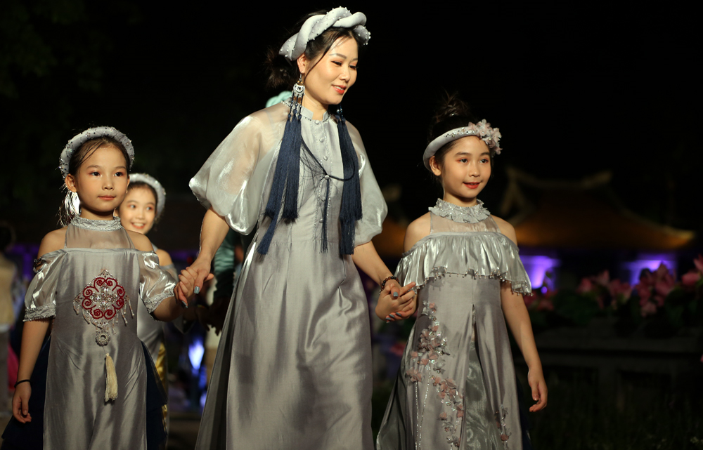 Văn Miếu - Quốc Tử Giám tối 28/6 lung linh bởi đèn và sen hồng hòa sắc cùng những chiếc áo dài, do 60 người mẫu chuyên nghiệp trình diễn.