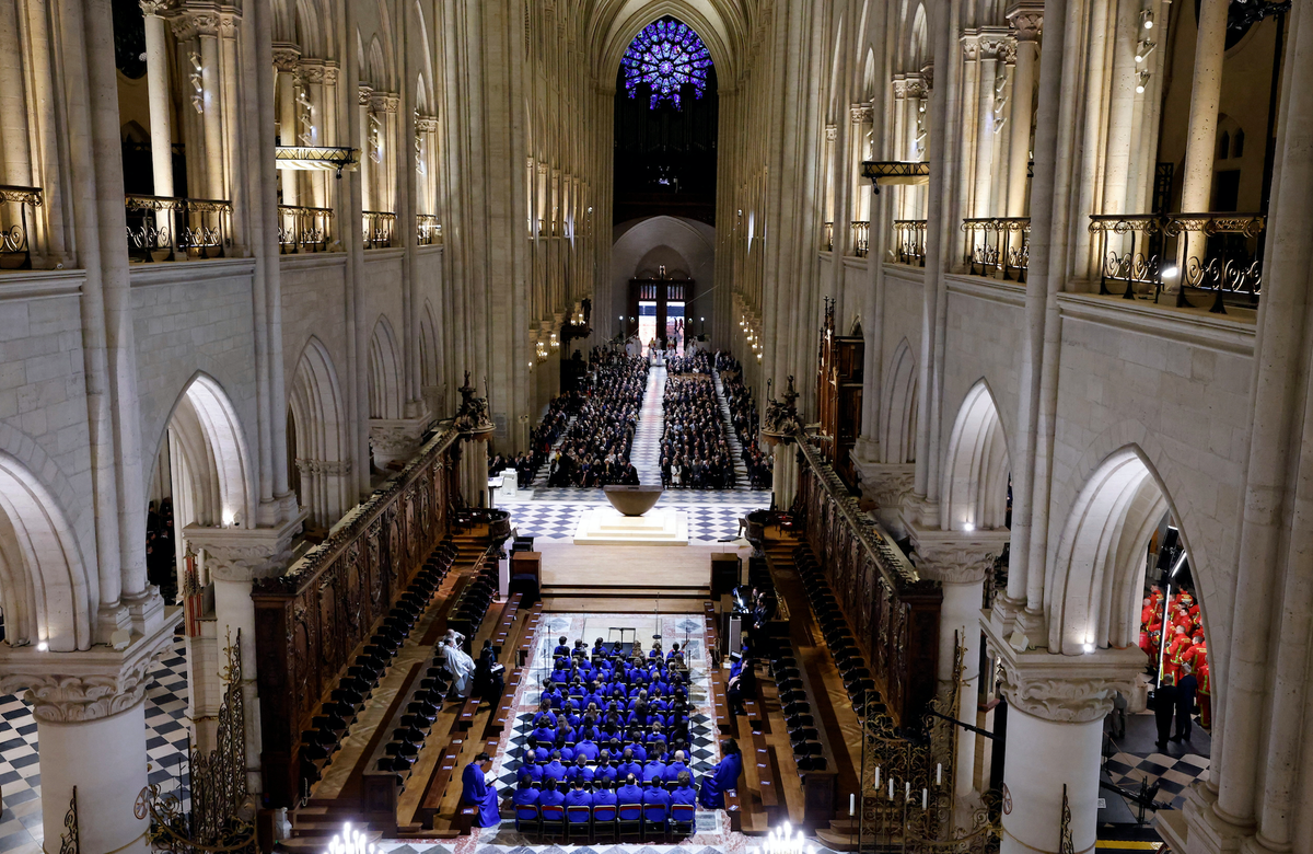 Tổng thống Pháp Emmanuel Macron có một bài phát biểu ngắn, trước sự chứng kiến của hơn 1.500 khách mời, bao gồm lãnh đạo của khoảng 50 quốc gia. Trong số đó phải kể đến Tổng thống đắc cử Mỹ Donald Trump, bà Jill Biden - vợ tổng thống Mỹ đương nhiệm Joe Biden, Tổng thống Ukraine Volodymyr Zelensky, hoàng tử Anh William cùng công nương Catherine và nhiều người nổi tiếng khác.