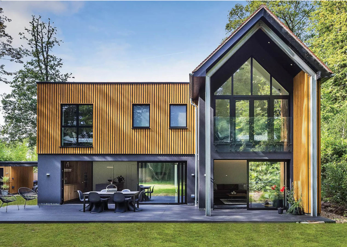 Nhìn từ bên ngoài chắc hẳn không ít người nhầm tưởng đây là căn nhà làm từ những vật liệu như bê tông, cốt thép,... Nhưng trên thực tế đây là căn nhà tiền chế, thiết kế mặt chính sử dụng cửa kính mang đến cảm giác rộng rãi, thoáng đãng.