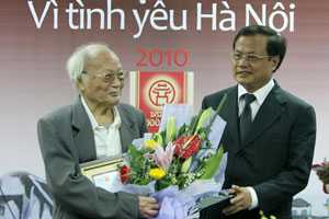 | G.S Phan Huy Lê thay mặt nhóm chuyên gia nhận giải thưởng Việc làm - Vì tình yêu Hà Nội. |