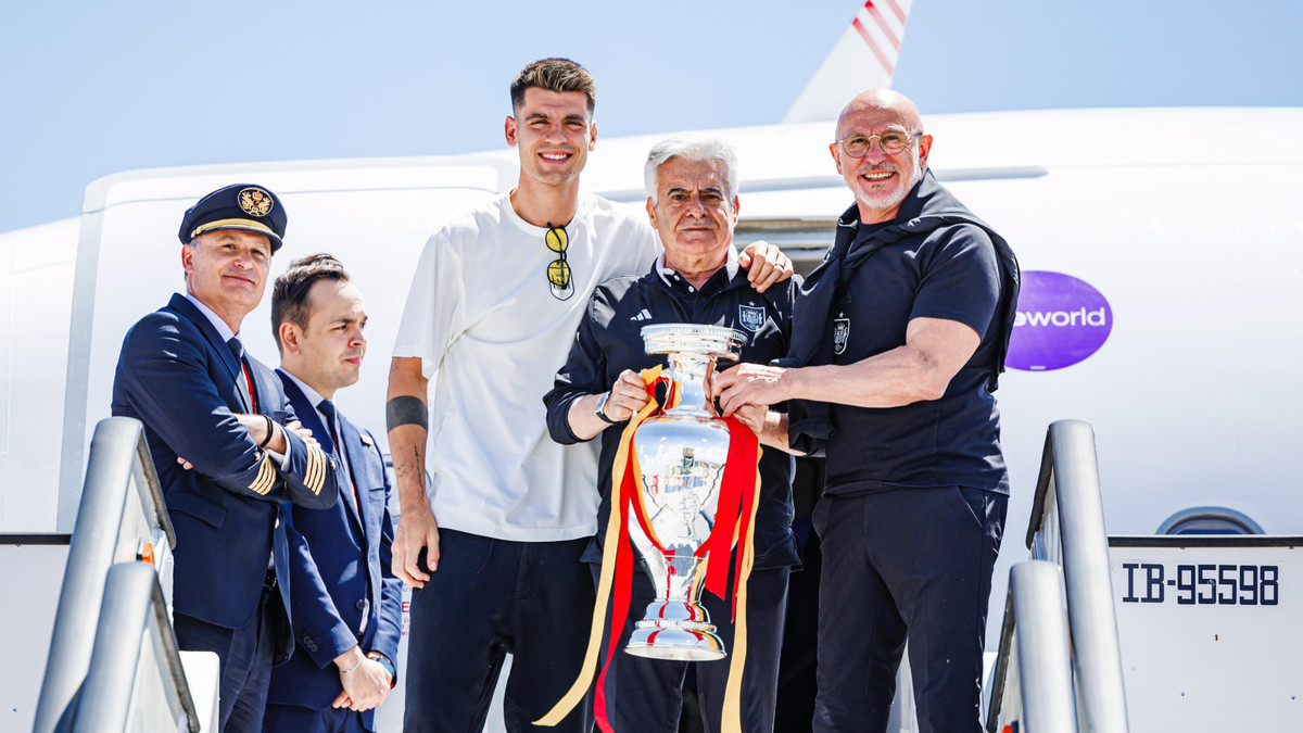 Đội tuyển Tây Ban Nha hạ cánh xuống sân bay Madrid - Barajas lúc 15h ngày 15/7 (giờ địa phương). Alvaro Morata là người đầu tiên ra khỏi máy bay. Đội tưởng Furia Roja chụp ảnh lưu niệm cùng Chủ tịch Liên đoàn Bóng đá Tây Ban Nha (RFEF) - ông Pedro Rocha - và huấn luyện viên trưởng Luis de la Fuente.