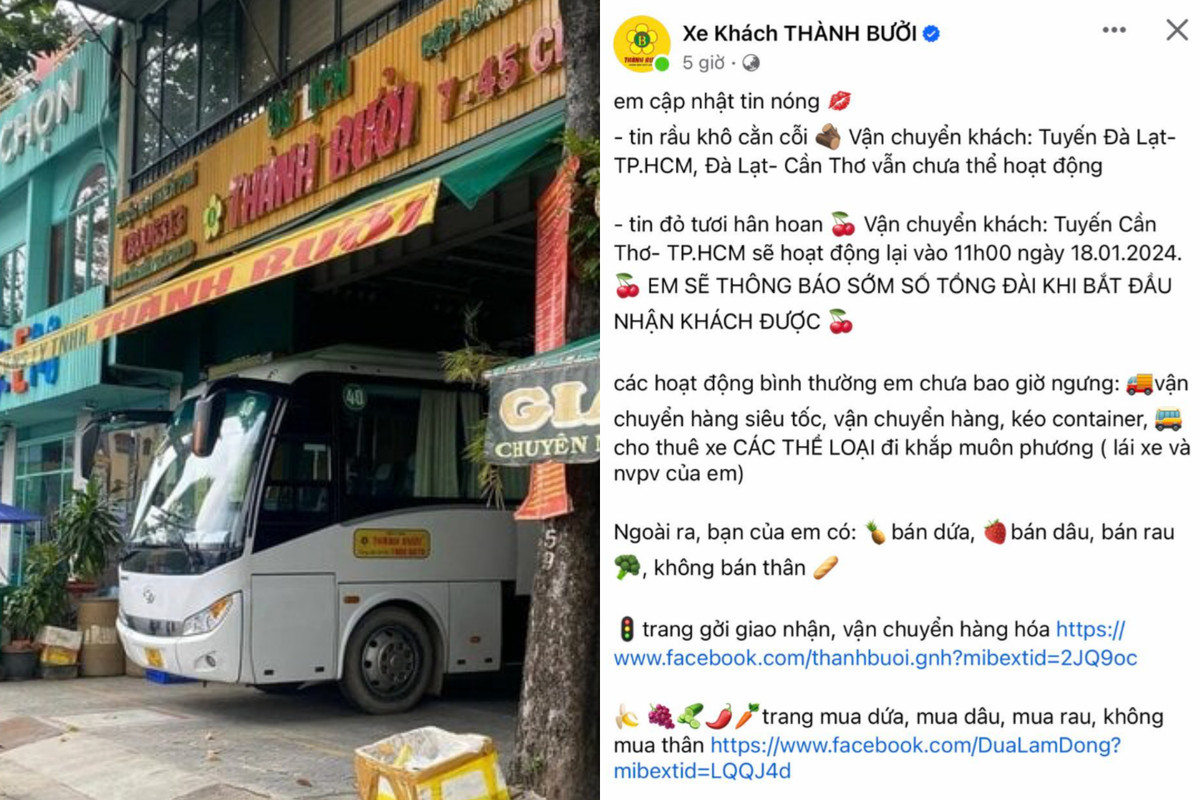 Ngày 9/1, Fanpage nhà xe khách Thành Bưởi thông tin tuyến Cần Thơ - TP.HCM sẽ hoạt động lại vào ngày 18/1. Cụ thể, Fanpage này chia sẻ: "Em cập nhật tin nóng, tuyến Đà Lạt - TP.HCM, Đà Lạt- Cần Thơ vẫn chưa thể hoạt động. Tin đỏ tươi hân hoan vận chuyển khách tuyến Cần Thơ - TP.HCM sẽ hoạt động lại vào 11h00 ngày 18/1. Em sẽ thông báo sớm số tổng đài khi bắt đầu nhận khách được".