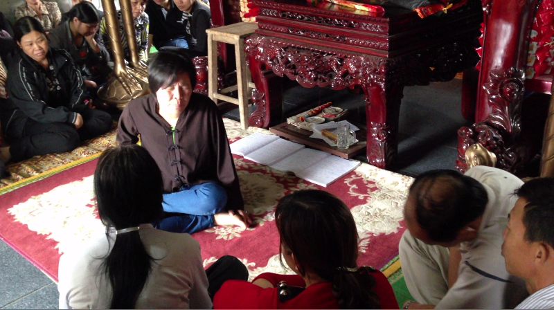 Khi đó, hội nghị đang diễn ra, hàng ngàn người có mặt. Mọi người đã bỏ hết hội trường ra ngoài sân xem “vong” Lợi nhập vào cô đồng Sinh. Ông Chu Phác bảo Lợi đi mãi không được, nên một bà chạy đến. Bà này cầm đèn pin, vạch mắt cô đồng Sinh, rọi thẳng đèn vào mắt, dùng tay đập mấy cái vào đầu, thế là “vong thăng”.