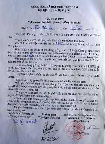 Cũng cần phải nói thêm, bản cam kết về việc thực hiện chỉ đạo của xã là trồng một loại lúa BC15 có nội dung xử phạt rất nặng đối với những trường hợp vi phạm. Nói cách khác, nội dung bản cam kết này có phần giống một công văn chỉ đạo của cấp có thẩm quyển, buộc người dân phải làm theo.