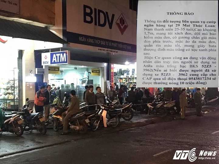 Trước đó, VTC News đã đưa tin, khoảng 17h ngày 6/12, trong lúc cán bộ nhân viên ngân hàng tại Phòng giao dịch Thành Nội (chi nhánh BIDV Thừa Thiên Huế, số 29 Mai Thúc Loan, Thành phố Huế) đang thực hiện các công việc cuối ngày giao dịch thì bất ngờ xuất hiện một tên cướp có vũ trang.