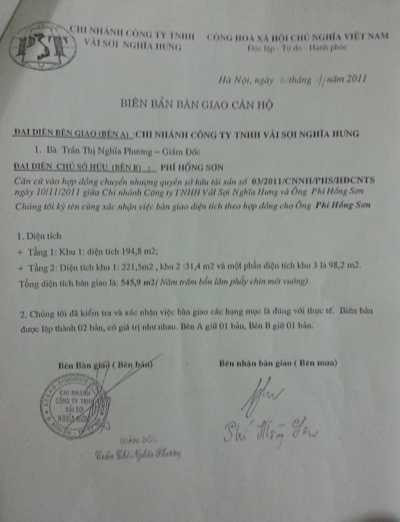 | Biên bản bàn giao nhà giữa ông Sơn và Giám đốc Công ty Vải sợi Nghĩa Hưng. |