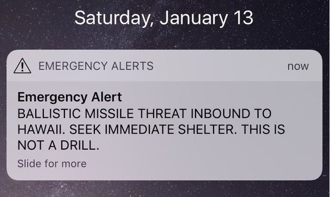Trước đó, vào khoảng 8h ngày 13/1 theo giờ địa phương, người dân Hawaii không khỏi hoang mang sau khi nhận được tin nhắn gửi qua hệ thống Cảnh báo Khẩn cấp, được sử dụng để cung cấp thông tin quan trọng. Hệ thống này được đưa vào sử dụng từ đầu tháng 12/2017 và chưa từng xảy ra sai sót trước đó.
