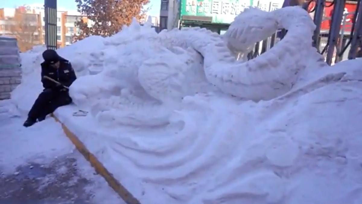 Nhân viên bảo vệ đã dành ba ngày để khắc một con rồng giống như thật từ tuyết tích tụ ở miền bắc Trung Quốc, con rồng tuyết có chiều dài 5m và cao hơn 2m.